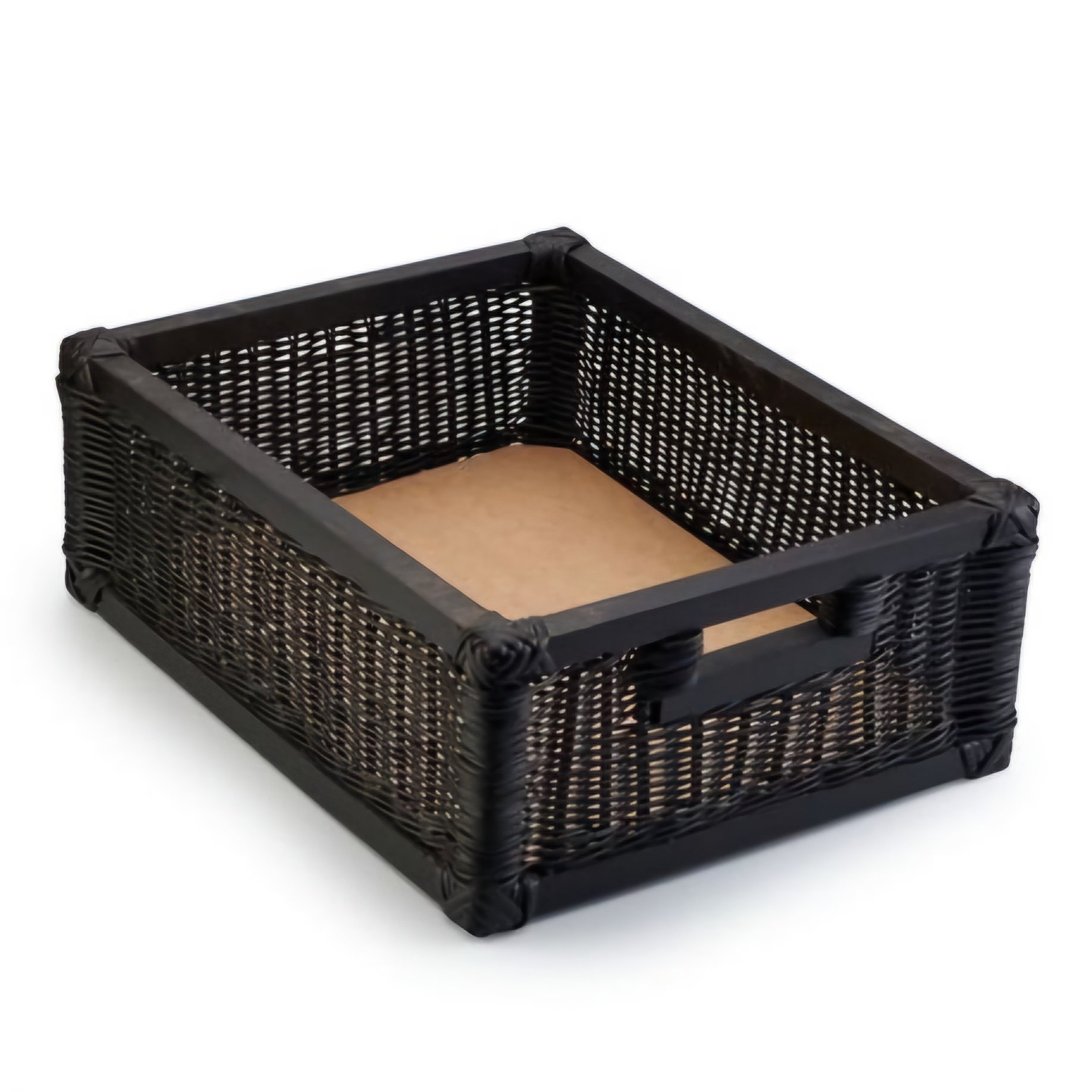 Part of the modern rustic collection, this black wicker basket unit is perfect for those seeking a stylish storage option that complements a variety of decor themes. Its subtle color blends well with diverse color schemes.
